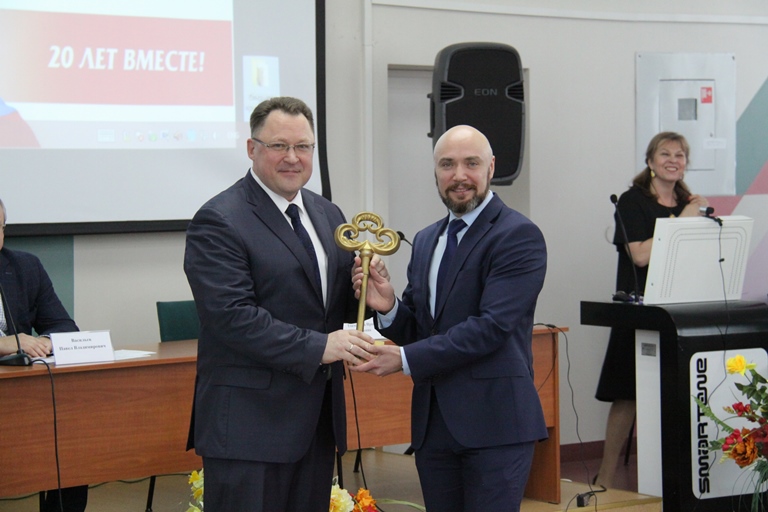 Игорь Смирнов передал ключ новому слушателю, генеральному директору ОАО «Коми тепловой компании Андрею Маруськину (Коми тепловая компания была в числе тех немногочисленных компаний, которая разрешила даже в сложившейся эпидемиологической ситуации пройти управленцам стажировку на своей базе). Андрей Маруськин принял ключ и произнес клятву своей группы: